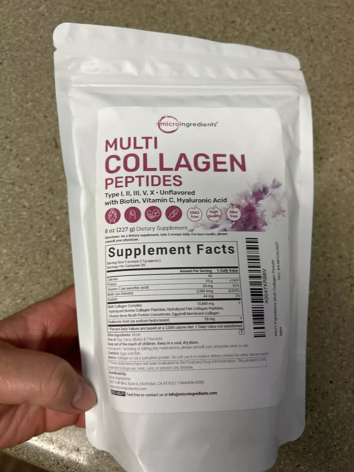 Contiene una mezcla de colágeno tipo I, II, III y X proveniente de fuentes bovinas, marinas, de pollo y huevo, más biotina, ácido hialurónico y vitamina C.